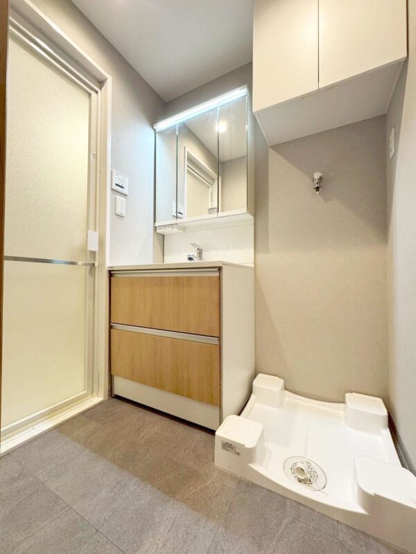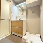 【WashRoom】洗面化粧台水栓、 ポップアップ交換 、フロアタイル貼替 、防水パン交換 、洗面室ドア交換 、浴室乾燥機交換