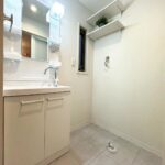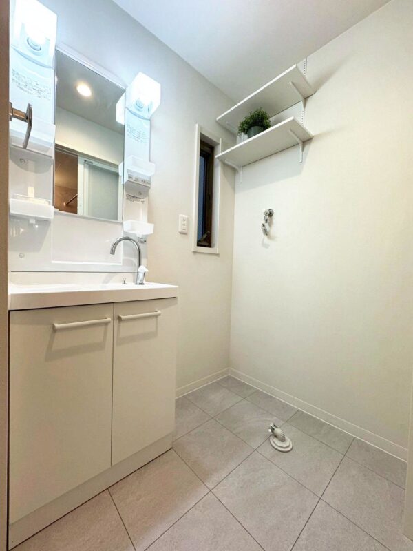 洗面所:洗面台・タオル掛け設置、洗濯水栓・排水トラップ移設、棚設置、フロアタイル貼替